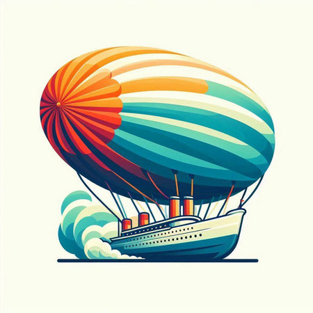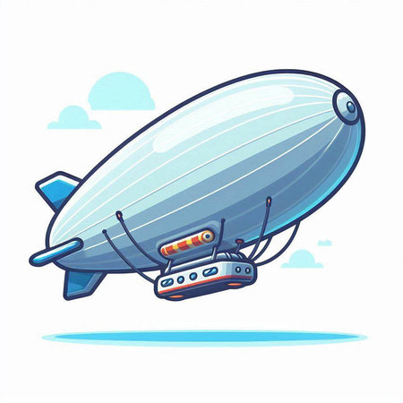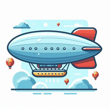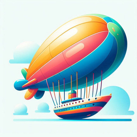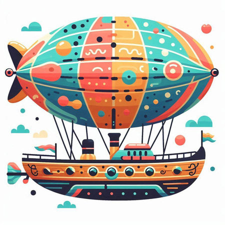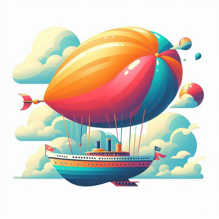 Vector illustration of an airship with a ship in the background.