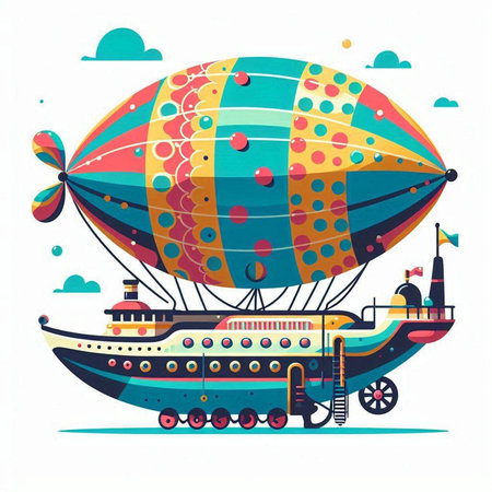 Illustration of a cartoon airship in the sky on a white background