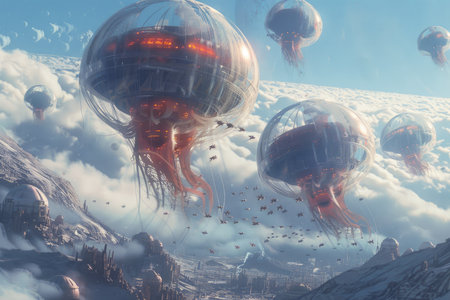 A futuristic 3D background of a floating AI research facility above an alien ocean. Transparent platforms reveal the shimmering bioluminescent creatures beneath the surface, while robotic drones glide through the air, maintaining the self-sustaining research habitat.