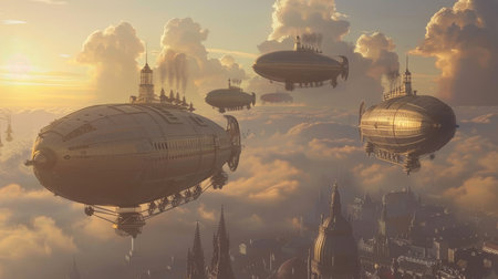 In the soft light of sunset, majestic steampunk zeppelins glide above the clouds over a sprawling, atmospheric cityscape.