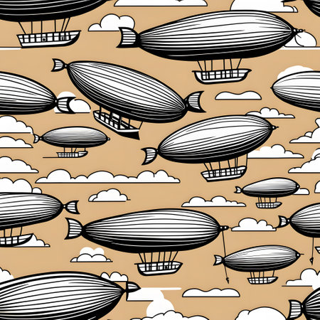 Fantastical steampunk airship glides through a cloudy sky, evoking a sense of adventure and nostalgia