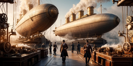 Steampunk Airships at Victorian Dock: Retro-Futuristic Fantasy Transportation Scene