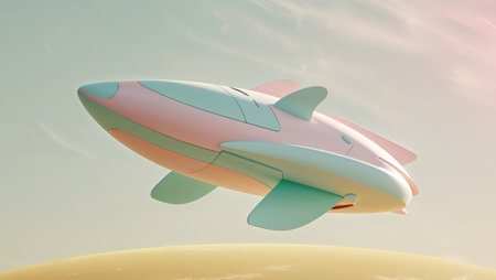 AI Generated. Retro Futuristic Spaceship in Pastel Colors Flying Above a Planet
