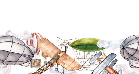 Seamless banner of retro aircrafts watercolor illustration on white backgrounds.