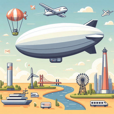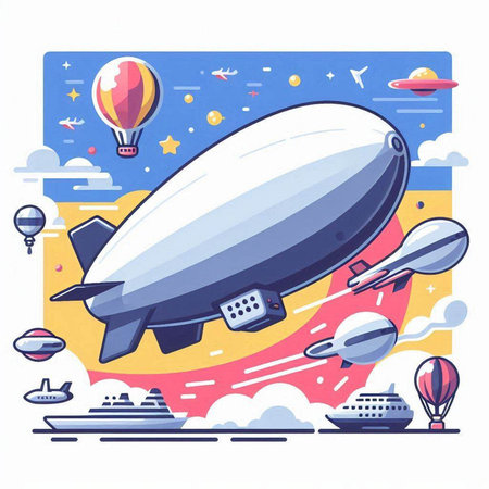 Airship and air transport. Vector illustration in flat style on the theme of air travel.