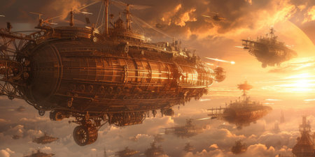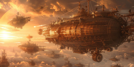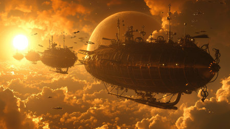 Fantasy steampunk airships float amongst clouds against a dramatic sunset backdrop, evoking adventure and exploration. Resplendent.