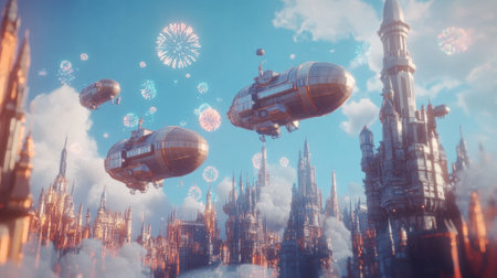 Airships gracefully float above a fantastical skyline, showcasing a series of majestic towers and spires. fireworks explode in vibrant colors against a backdrop of fluffy clouds and a vivid blue sky, creating a whimsical, steampunk-inspired scene.