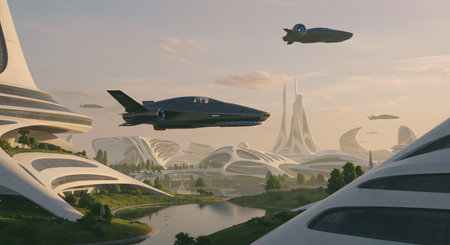 A city landscape showcases advanced architecture and technology. A river flows through, while flying cars glide above, representing future city and transport concepts or eco-friendly design ideas