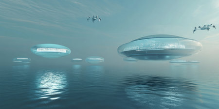 futuristic airship floats tranquil ocean surrounded vibrant clouds and warm hues creating breathtaking spectacle sky.