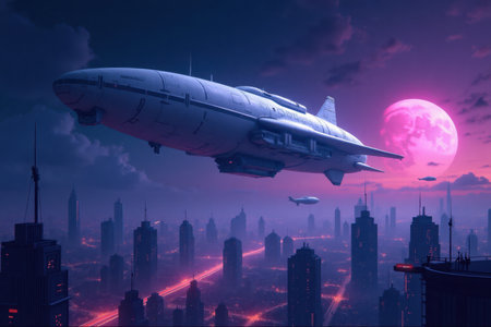 A futuristic white airship flies above a sprawling futuristic city with glowing buildings, neon lights, and flying cars, under a dark purple and blue night sky.