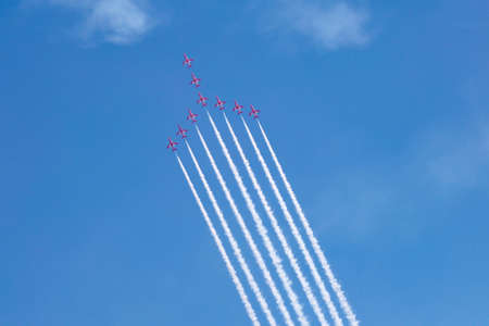Gdynia, Poland - August 21, 2021: The Royal Air Force Aerobatic Team of the United Kingdom at the Aero Baltic show in Gdynia, Poland.