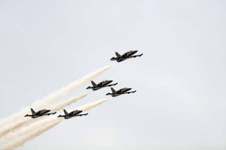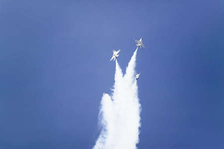 Airshow of military jet fighters. Group of military airplanes performs maneuvers with a smoke trace. Aviation background