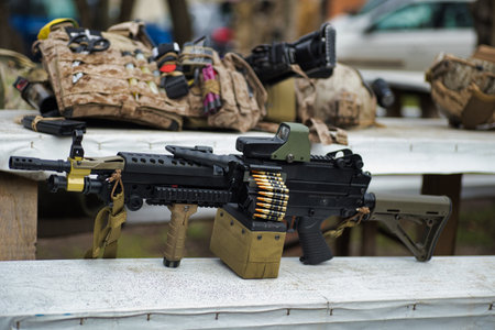 airsoft weapon machine gun, staged photo of airsoft equipment, military theme