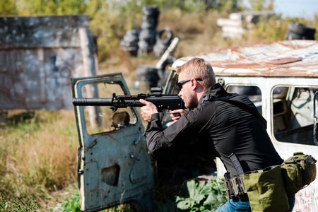 Terrorizing automatic maverick rifle aim near to patrol truck . High quality photo