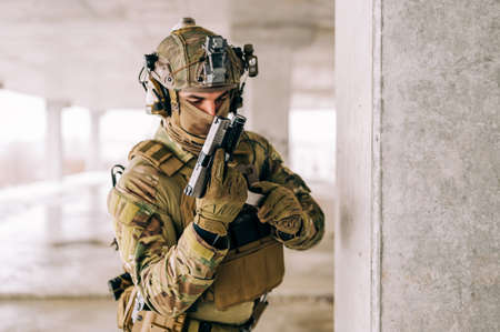 A bearded soldier in uniform of special forces in a dangerous military action in a dangerous enemy area. Selective focus