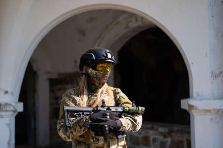 A special forces soldier storms a destroyed building. The concept of war and military anti-terrorist exercises. the focus is on the sight of the machine gun, the blurred effect..