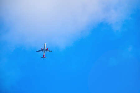 Commercial airline flying on blue sky and white fluffy clouds. Under view of airplane flying. Passenger plane after take off or going to landing flight. Vacation travel abroad. Air transportation.