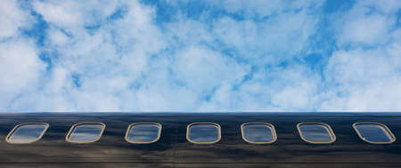 Close up of an airplane windows of private business jet, panoramic layout