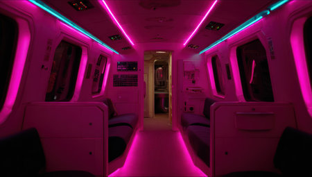 An interior shot reveals a futuristic train carriage illuminated by vibrant neon pink lights. The scene showcases rows of seating and overhead lighting, creating a modern and stylized atmosphere. The composition emphasizes symmetry and linear perspective. This image could be suitable for various commercial or editorial applications related to transport or design.