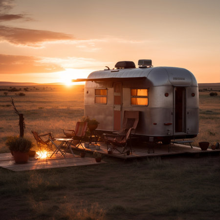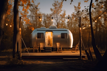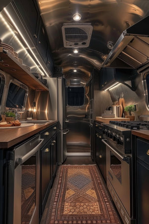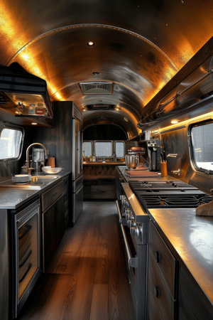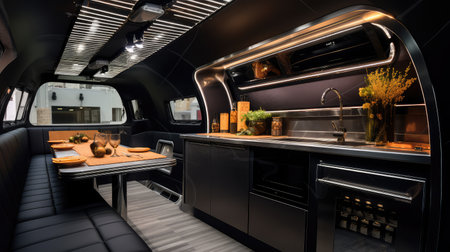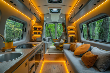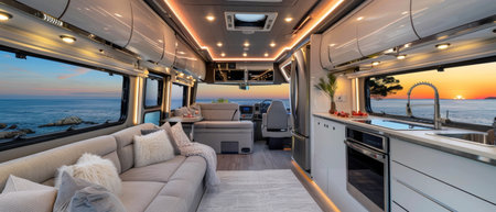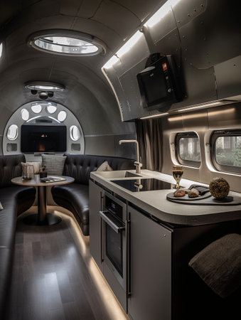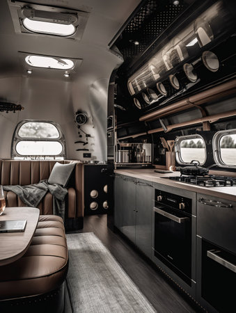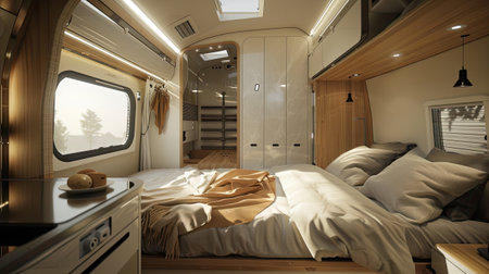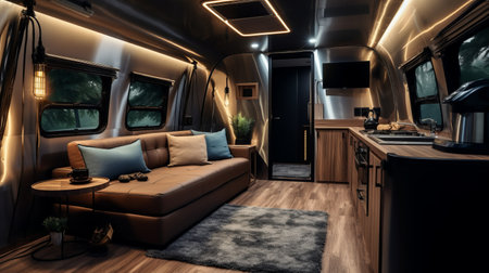 Modern caravans, trailers, and campers feature stylish and functional interior designs with a range of amenities for a comfortable mobile living experience. AI Generative