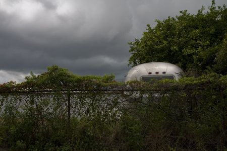 Semi low key Dark image of old silver trailer among foliage as storm clouds roll in