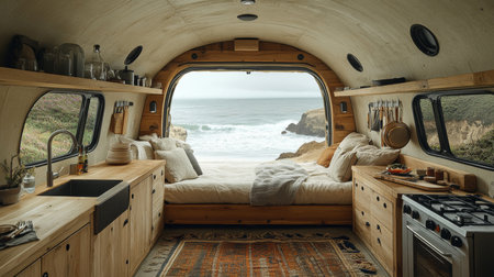 Cozy beachside camper interior featuring a stunning view of the ocean and natural landscapes during the day. Generative AI