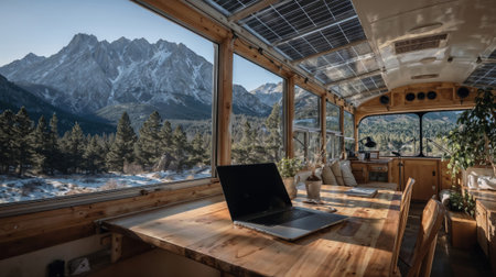 Converted vintage bus tiny home interior with laptop on wooden table overlooking snowy mountain landscape through large windows. Remote work and van life lifestyle concept.