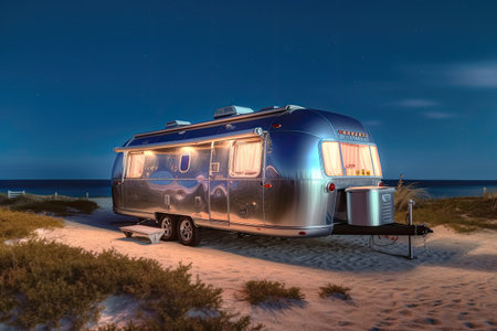 3D rendering of a caravan on the beach at night in Spain