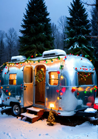 Christmas Lights On A Vintage Airstream, In A Snowy Camping Site. Generative AI