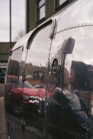 Wandsworth Town, London | UK - 2021.04.03: Shiny Airstream Style Caravan, Trailer Parked on the sidewalk