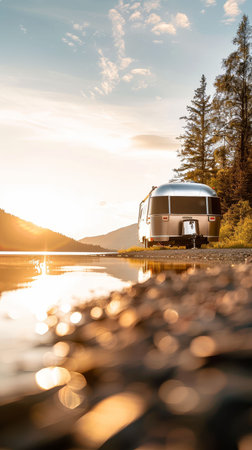 Scenic view of a modern trailer parked beside a tranquil lake at sunset, surrounded by lush trees and a serene atmosphere.