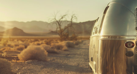 Take a trip back in time with this image of a vintage Airstream trailer parked in the middle of a sprawling desert landscape, with a stunning sunset visible in the background. The trailers exterior is polished to a shine, a true beauty that stands out in the barren landscape. A small campfire is visible outside the trailer, inviting you to relax and enjoy the warmth of the fire while watching the sunset. A telescope is set up on a small table outside the trailer, offering a stunning spot to observe the stars in the clear desert sky, and exploring the wonders of the universe. This is the perfect location for stargazers, adventurers, and anyone seeking the simple pleasures of life on the road.