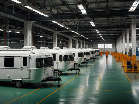 Caravan of camper cars in a warehouse, production line.