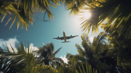 Airplane over tropical palm tree. Island sky. Generate Ai