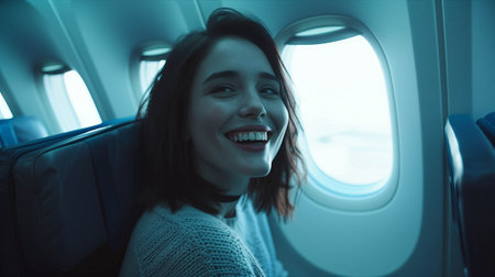 Serene airplane interior with a glimpse of sky from cozy seats perfect for travel and vacation vibes