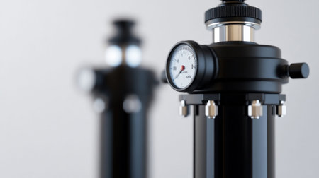 High-quality close-up image showcasing modern metallic equipment with intricate valve and pipe connections, set in an industrial environment.