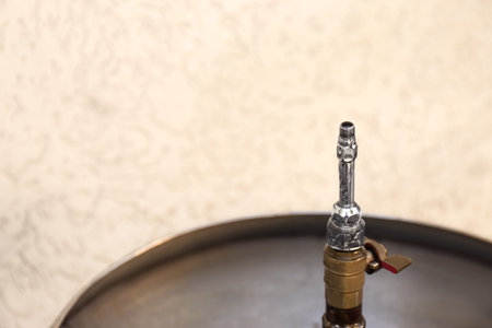 A close-up shot of a fuel tank's valve and piping, showcasing the intricate engineering against a blurred background of other containers. --ar 3:2 --v 6 Job ID: d952471a-8dd3-4d70-bcc4-4f2c2dba332b