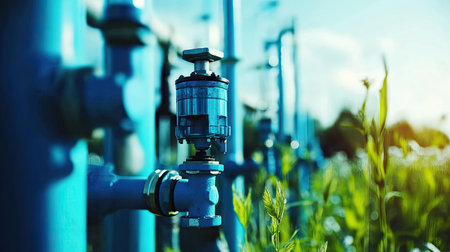 A close-up view of a modern water valve set against a vibrant green field, capturing the merging of nature and industrial technology in beautiful morning light.