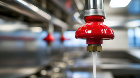 A striking close-up of a red faucet in a commercial kitchen, showcasing water flowing effortlessly, highlighting functional design and modern industrial aesthetics.