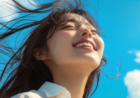 Young Asian woman with short hair smiling against a clear blue sky. Wind moving her hair, showing happiness and freedom