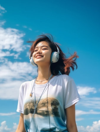 Generative AI : beautiful girl listening to music on headphones in the sky