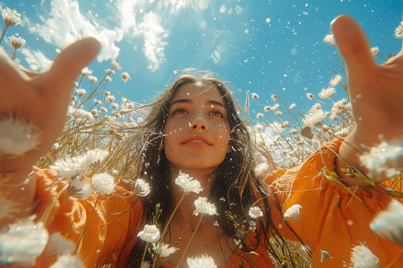 A young woman in an orange dress enjoys a sunny day in a blooming field, surrounded by white flowers and blue sky, capturing the essence of freedom and joy.