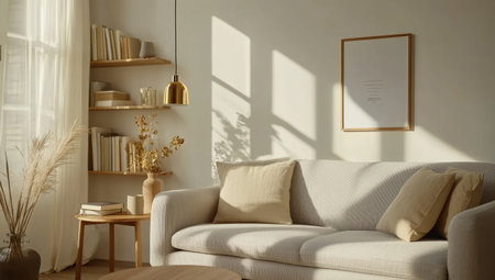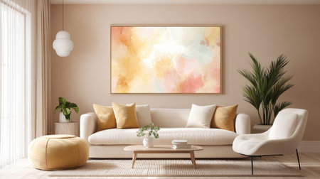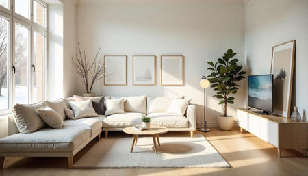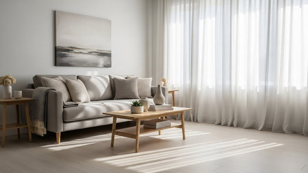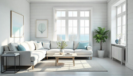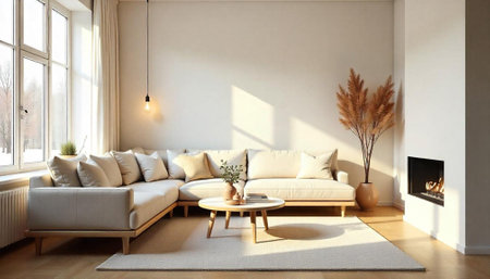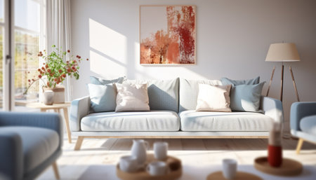 modern bright interiors 3D rendering illustration - scandinavian style living room