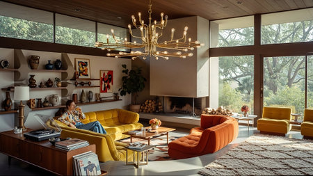 Interior of a loft. Living room with midcentury modern furniture. Concrete floor