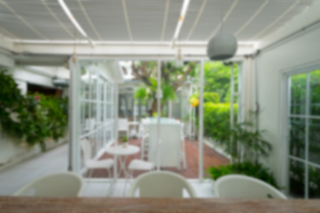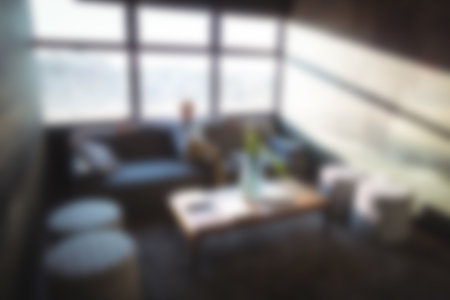 Abstract blur restaurant and coffee shop cafe interior for background. Abstract defocused bokeh in modern restaurant style. Through the window in coffee shop.