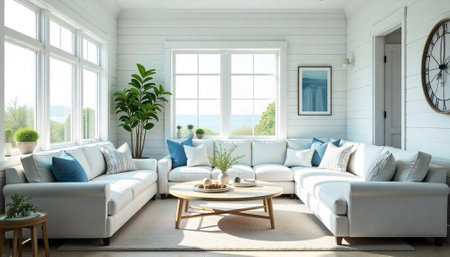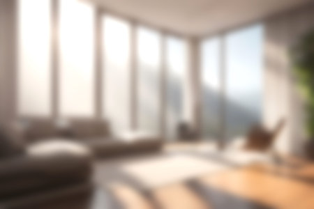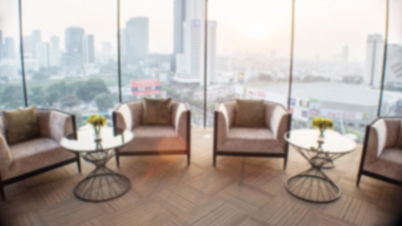 Blur modern livingroom with hill and soft sunlight at big window for background usage. blur interior background concept. white and bright tone. Business concept.