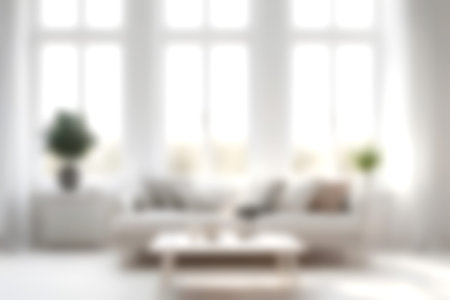 Blur modern livingroom at home with soft sunlight at big window for background usage. blur interior background concept. white and bright tone. Business concept.