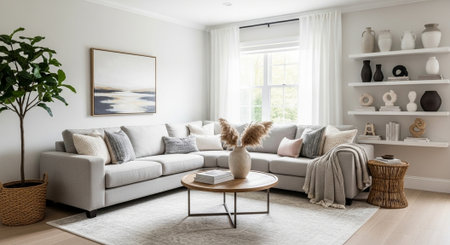 Interior of modern living room with white walls, wooden floor, beige sofa and coffee table. 3d render
