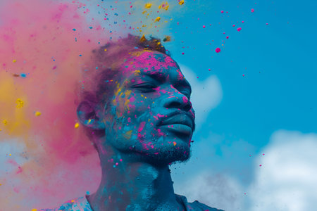A man is surrounded by colorful paints at the Holi festival in a close-up portrait