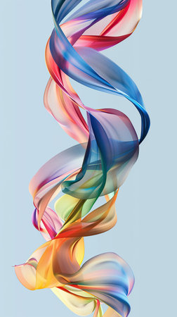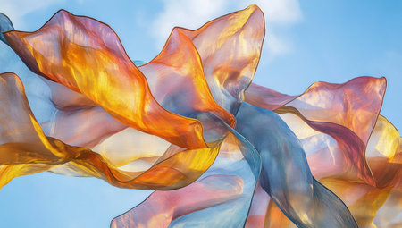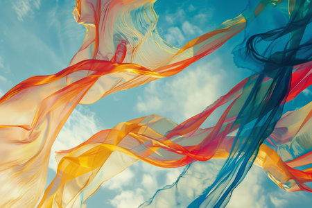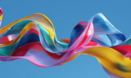 Dynamic composition featuring vibrant, flowing ribbons in multiple colors against a bright, clear blue backdrop. The image showcases textures, light reflections, and a sense of movement suggesting an airy or atmospheric setting. Suitable for use in design projects, advertising, and other creative purposes that require a modern or artistic aesthetic.
